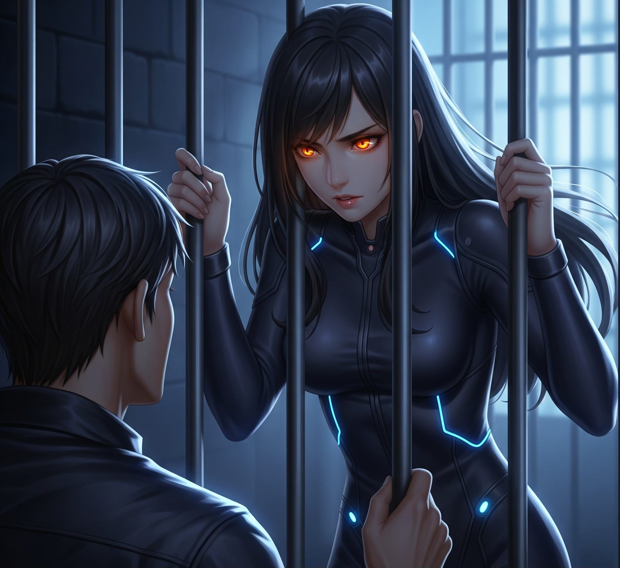 Korvus kept up his advance, eyes shifting to the cell’s occupant. Human-looking, his overlay said she stacked 160cm tall, her face close to the bars as she gripped them. She looked slender, but the prison fatigues hid a lot, only hinting at an ample bust. Strikingly beautiful, her irises glowed orange as they tracked him across the floor. She said nothing, but he noted her hands tightened on the bars as he approached.