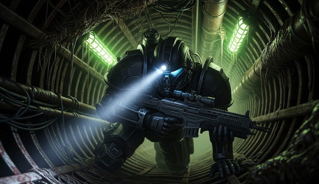 He crouched, then jumped, hands grasping the shaft’s lip. Metal groaned at the weight of the Corrector and his armour, but it held. Good Communion technology would be engineered for a little extra load. Korvus muscled himself inside. He found himself in a standard vent shaft. It wasn’t large enough for him to crouch, but he could crawl.